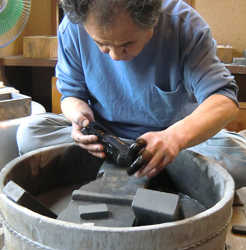 以上の手彫り及び磨きの行程の後、つや出しと劣化防止のため、墨液やうるしなどを塗って、硯を仕上げます。